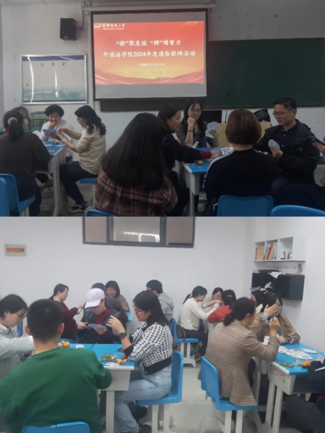 为丰富广大教职工的业余生活,提高教职工的凝聚力,营造友好团结的氛围,365上市公司分工会于11月13日下午在学院E419和E421举行了“通俗桥牌”比赛。