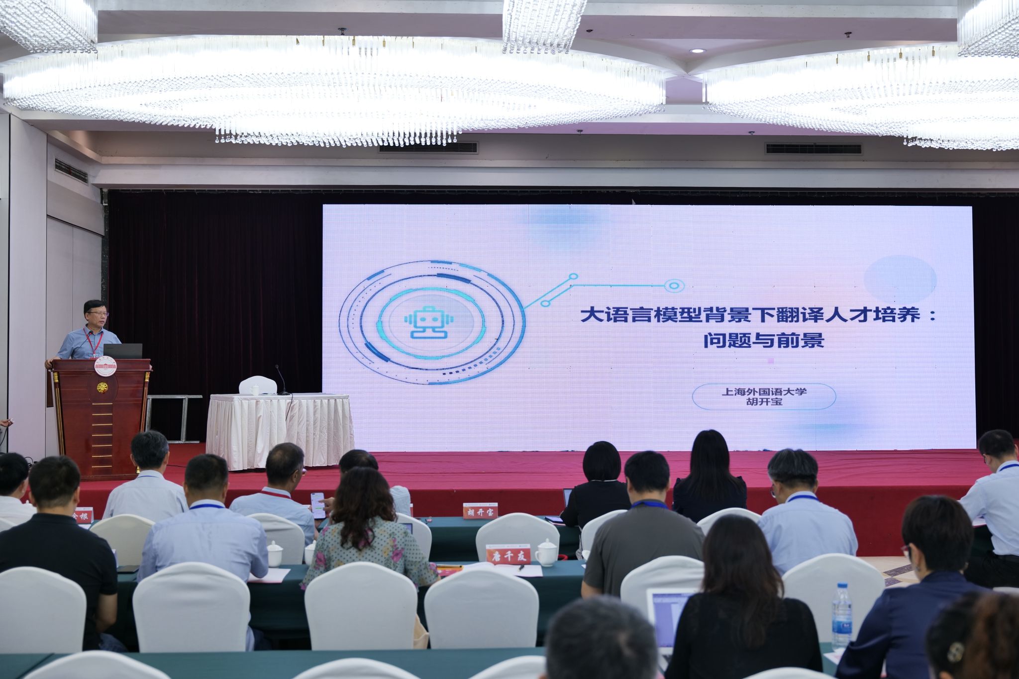 会议主旨报告环节,教育部国家重大人才计划特聘教授、国家社科基金重大项目首席专家、上海外国语大学语言科学研究院院长胡开宝教授,全国翻译专业学位研究生教育指导委员会副主任委员、广东外语外贸大学赵军峰教授,教育部社科重大攻关项目首席专家、全国翻译专业学位研究生教育指导委员会委员、上海交通大学朱一凡教授,国家重大人才工程特聘教授、教育部高等学校外指委法语分委员会副主任委员、全国翻译专业学位研究生教育指导委员会委员、南京大学刘云虹教授,中国翻译协会国际化服务专业委员会副秘书长、北京语言大学韩林涛博士等八位专家先后发言,就人工智能背景下翻译人才培养、智能语言服务、产教融合、徽派文化外译等论题作了精彩报告。