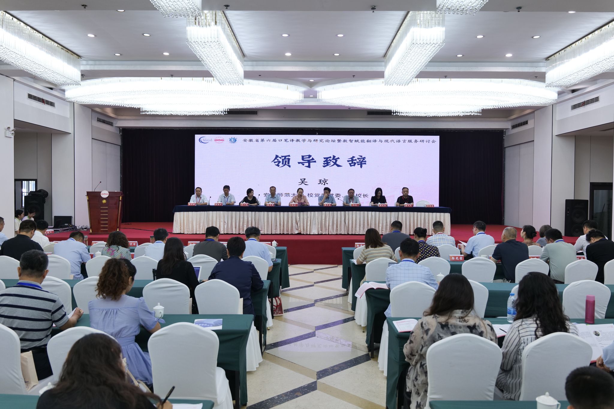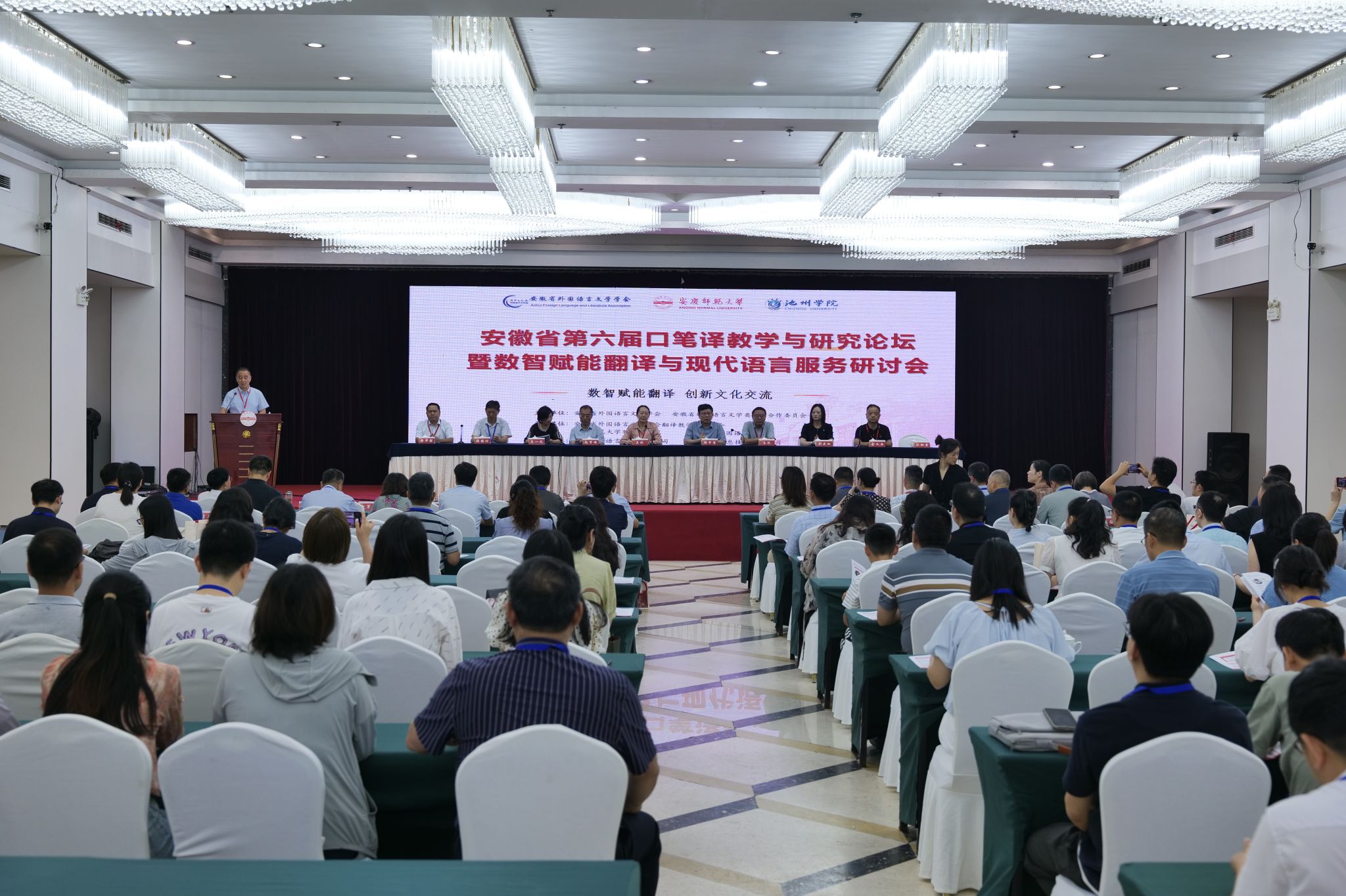 7月4日至6日,365上市公司联合池州学院365上市公司承办安徽省第六届口笔译教学与研究论坛暨数智赋能翻译与现代语言服务研讨会。学校党委常委、副校长吴琼,安徽省外国语言文学学会会长朱跃等应邀出席开幕式并致辞。来自省内18所高校的120名代表参加了会议。