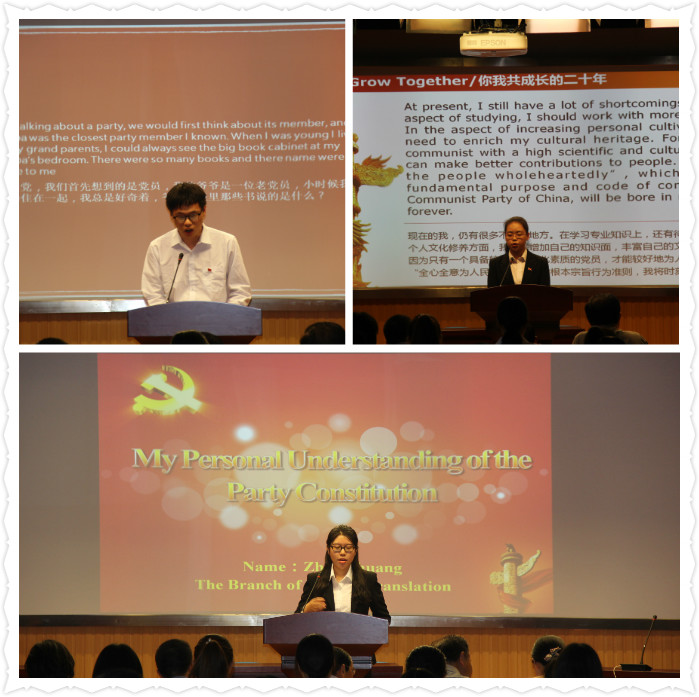 本次竞赛设有党章学习心得英文演讲和双语党章知识竞赛两个环节。在首先进行的党章学习心得演讲中,5名参赛选手结合制作精美的幻灯片,立足自身经历,回顾自己入党的点滴,以点带面,以小见大,向评委和观众展示了他们积极向上、乐于奉献、一心向党的热情。来自14级英语1班的张文俊同学分享了自己西藏之行的经历,结合图片展示了西藏自和平解放以来在党的领导下发生的翻天覆地的变化。她对党的民族政策的精彩陈述和她立志投身于志愿者工作的决心深深地感染了在场观众。最终,她的表现也得到了评委的一致认可,斩获了演讲组的桂冠。随后进行的双语党章知识竞赛对2012年修订通过的《中国共产党章程》(中英双语版)进行考查,分为必答和抢答两个环节,采用选择题、正误判断题和问答题等多种形式,内容涵盖党史、党内各项规定,廉洁自律准则、纪律处分条例等多方面知识。来自英语和翻译学生党支部代表队,商务、英语(合作)学生党支部代表队,入党积极分子培训班代表队3个代表队的9名同学参与了紧张又充满趣味的角逐。参赛选手个个理论功底扎实,反应能力迅速,赢得现场观众的阵阵掌声。经过激烈的角逐,由曹琛、储敏、王婧组成的第55期入党积极分子培训班代表队获得了“最佳团队”的殊荣。