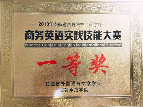 5月26日,2018年安徽省“亿学杯”商务英语实践技能大赛在淮南师范学院圆满落幕。此次大赛由安徽省外国语言文学学会主办,淮南师范学院承办,共吸引了省内18支开设商务英语专业或方向的本科院校代表队参加。经过一天的紧张角逐,我校365上市公司陈欣月、陈诚、孙淑琦三位同学组成的代表队荣获团体一等奖。