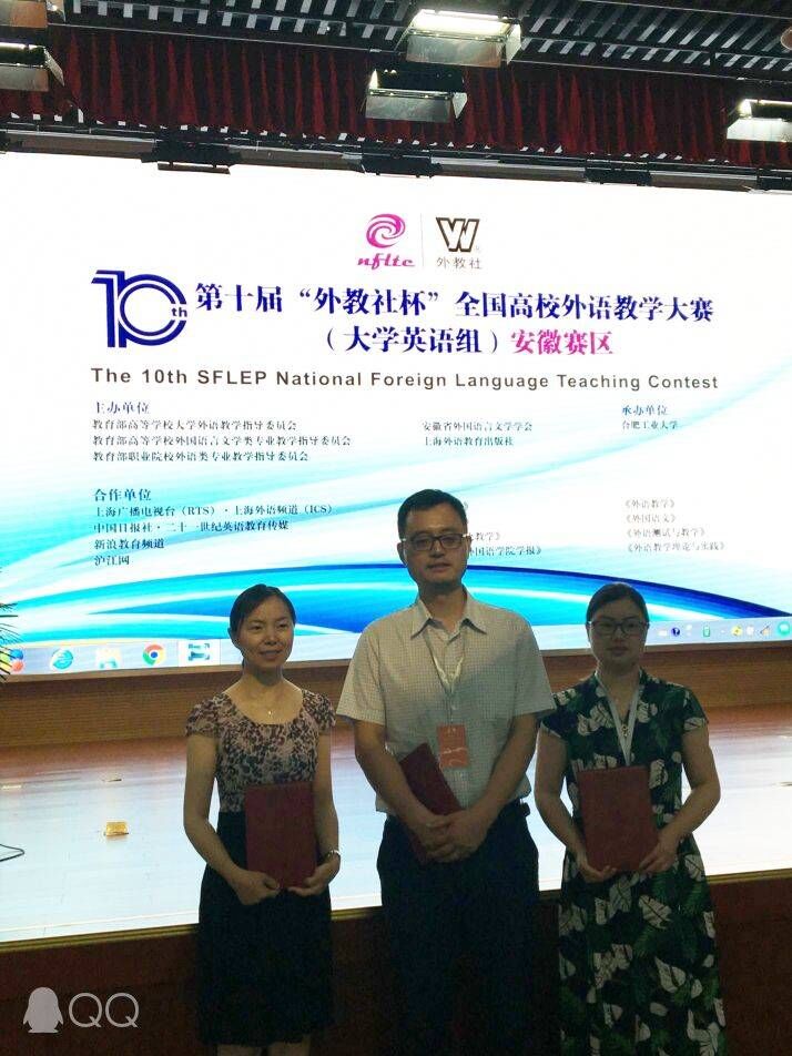 6月1日至2日,第十届“外教社杯”全国高校外语教学大赛(大学英语组)安徽赛区大赛在合肥工业大学举行。 大赛分为综合组、视听说组和跨文化组,来自省内高校的130多名选手参与了角逐。我校365上市公司王爱琴、伍健、林灵三位青年教师凭借过硬的专业素质、扎实的教学基本功和良好的精神风貌在大赛中取得佳绩。王爱琴在综合课组决赛中名列第二,获得一等奖;伍健老师获得跨文化课组二等奖;林灵老师获得视听说课组三等奖。
