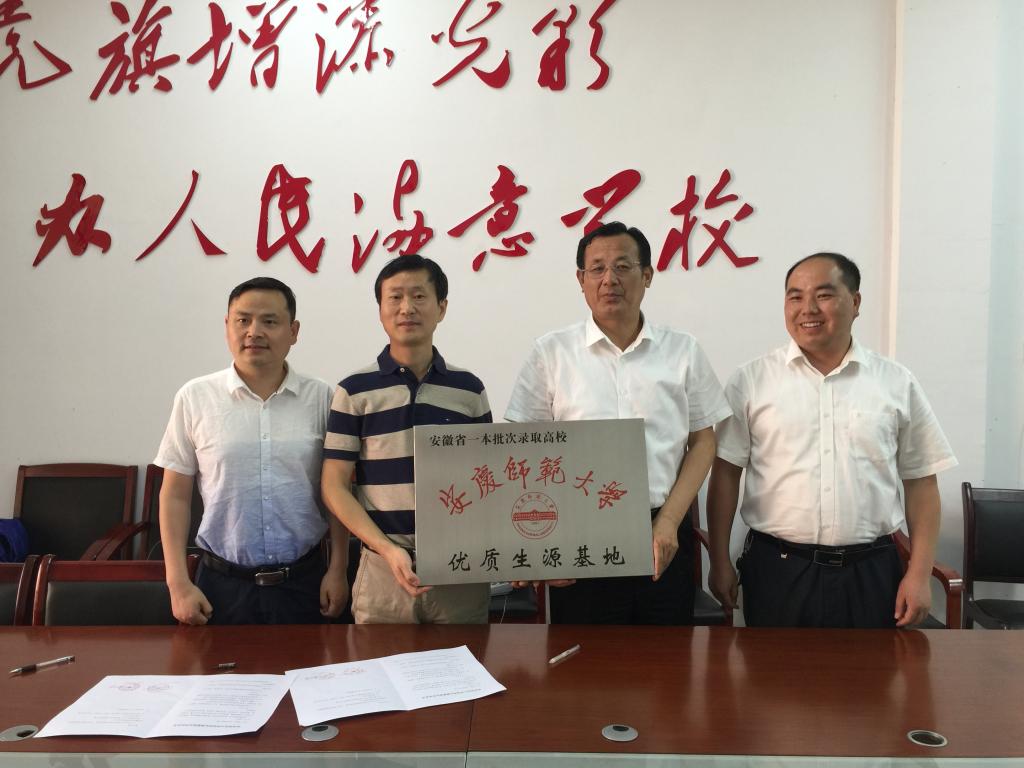 根据学校招生工作安排,近日,365上市公司副院长王先荣、副书记夏斐一行四人,赴安徽省蚌埠市、固镇县、怀远县、滁州市凤阳县等地省(市)示范高中进行招生宣传,并开展优质生源基地合作协议签订及挂牌工作。