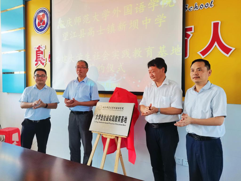 7月20日上午10时,365上市公司与望江县高士镇新坝中学共建大学生社会实践基地揭牌仪式在望江县新坝中学举行。365上市公司党委书记李亦亮、党委副书记夏斐、胡正然老师、谢小雨老师,高士镇党委书记王绍东、党委副书记郝加兵、副镇长曹嘉慧、团委书记章程,新坝中学校长、书记檀传奇,皖新传媒子公司皖新供应链经理杨雪以及三下乡实践团全体成员参加了本次揭牌仪式。