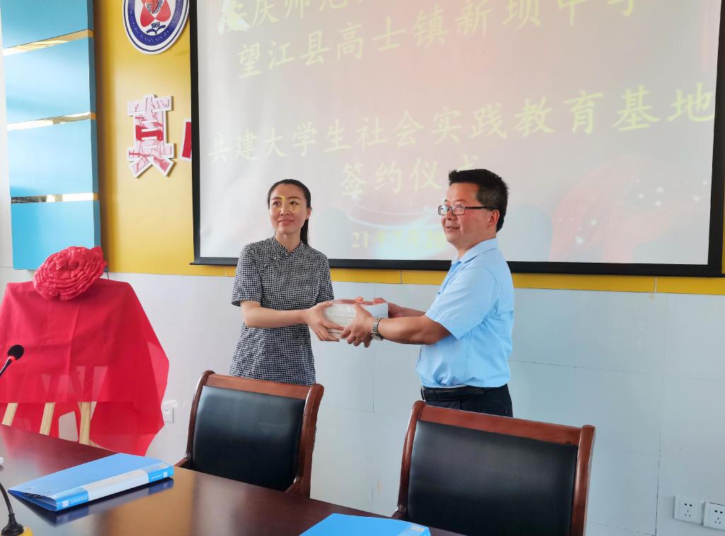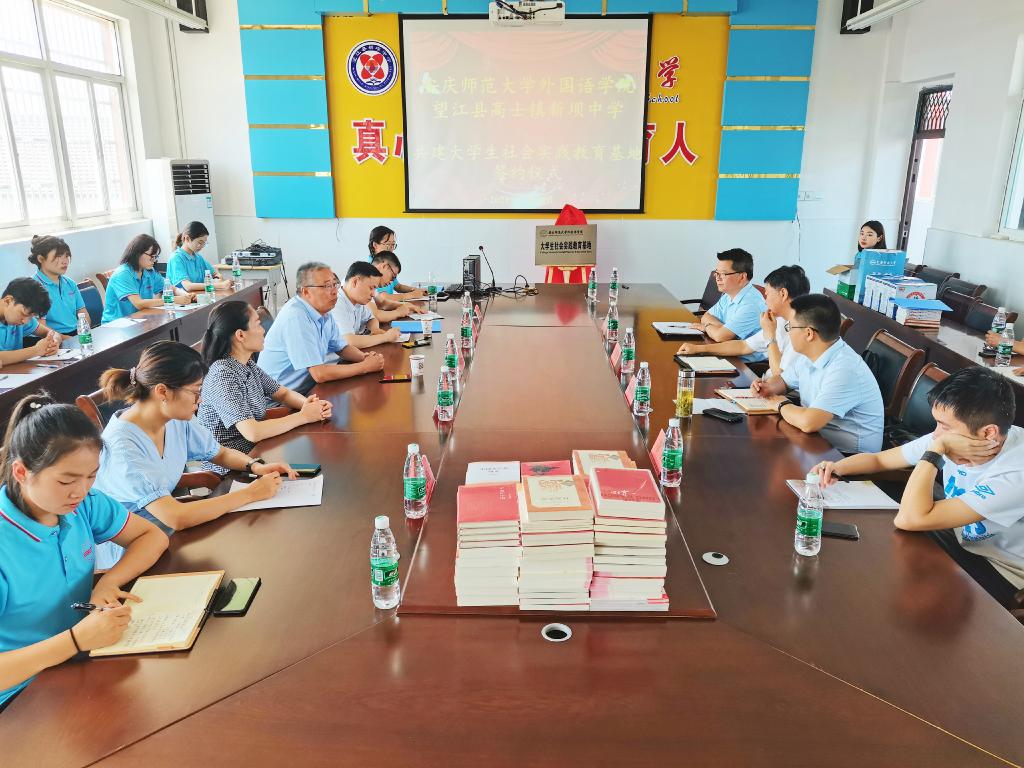 会上,英国上市官网365外国学院与望江县新坝中学签署了共建大学生社会实践教育基地协议书并举行了揭牌仪式。皖新传媒子公司皖新供应链杨雪经理代表单位向新坝中学捐赠了图书。