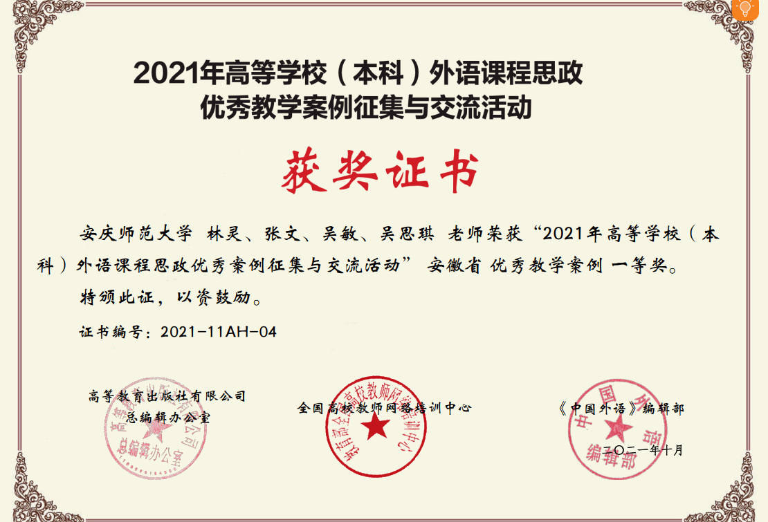 10月8日,由高等教育出版社、全国高校教师网络培训中心、《中国外语》编辑部联合举办的“2021年高等学校外语课程思政优秀教学案例征集与交流活动”结果揭晓,我院大学英语课程思政教学团队林灵、张文、吴敏、吴思琪在决赛中以题为“Integrating Expertise with Values to Better Serve the Motherland”荣获安徽省一等奖。