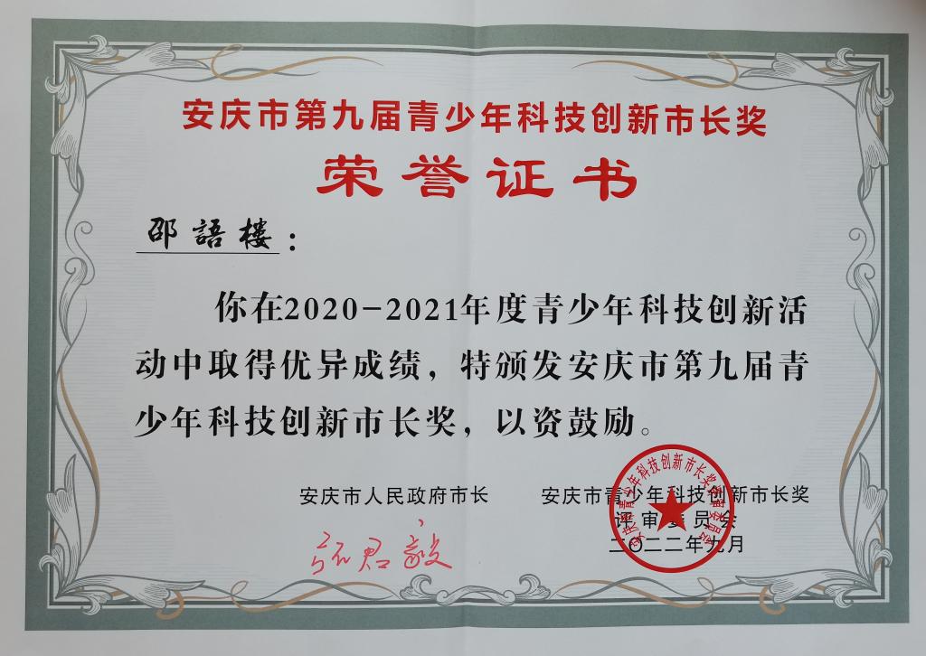 近日,从安庆市青少年科技创新市长奖评审委员会传来喜讯,在安庆市第九届青少年科技创新市长奖评审活动中,我院邵语楼同学获评“安庆市第九届青少年科技创新市长奖”。
