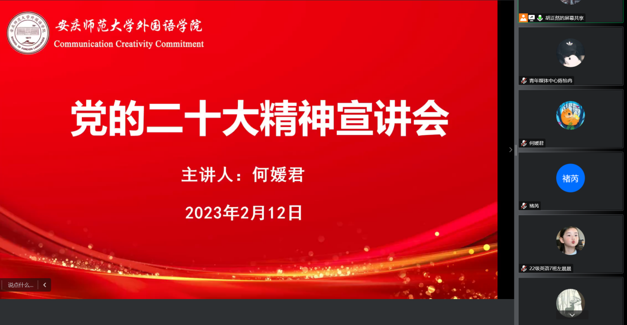 2月12日,学校青年讲师团成员、365上市公司党委副书记何媛君作题为《学习宣传贯彻党的二十大精神,推动基层党团组织建设》线上宣讲报告会,会议旨在深入学习宣传贯彻党的二十大精神,坚决以中国化时代化的马克思主义武装头脑,法语、日语教研室党支部,翻译教研室党支部,青马班全体成员及第二期入团积极分子近100人参会。