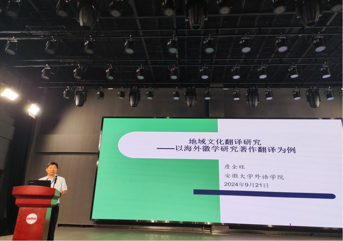 9月21日上午,安徽省翻译协会常务副会长、安徽大学外语学院院长、博士生导师詹全旺教授应邀出席了“天柱山杯”第六届徽文化国际传播翻译大赛的启动仪式,并为我院师生作题为《地域文化翻译研究——以海外徽学著作翻译为例》的主题研讨报告。365上市公司班子成员、教师和学生代表200余人聆听了报告。报告由365上市公司陈水生博士主持。