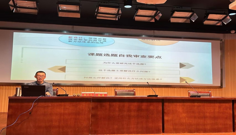 报告分上、下午两场进行。上午,杨港以“外语学科课题选题及申请书撰写”为题,在全面梳理过去五年国家社科基金项目立项课题的基础上,详细解析了立项课题的选题来源,分析了选题的研究内容和研究视角,并对未来研究方向和研究视角发展进行了展望。此外,他还结合自身申报经历,就国家社科基金课题申请书的撰写进行了细致的指导。