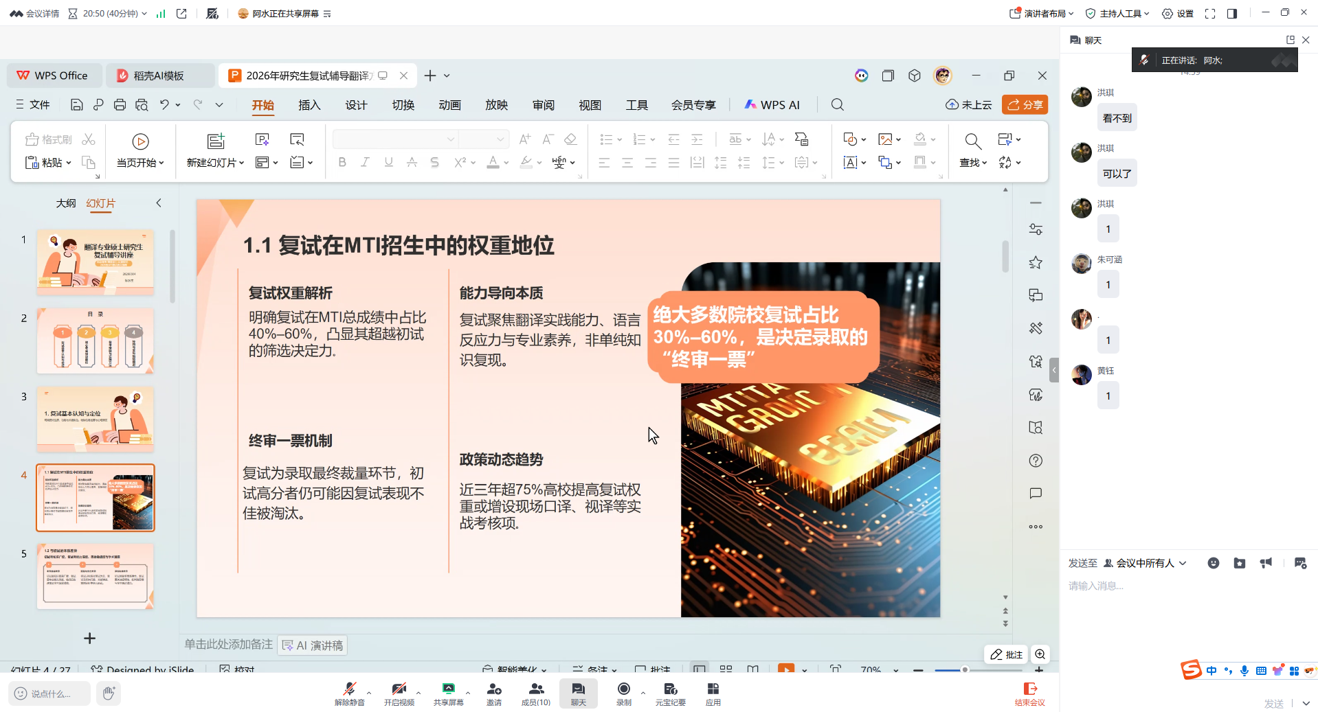 下午的线上辅导会由翻译教研室陈水生博士主讲,他聚焦应试技巧与面试礼仪,从知识应答、着装要求、面试状态等方面进行详细指导。他建议学生提前准备应对不会问题的应答话术,将“我不会”转化为“我会努力学”;着装要简单大方,展示青年学子风采;面试时语速适中,与导师保持眼神交流,自信大方。