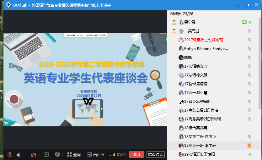 教师代表分享在线教学心得体会,并就在线教学如何进一步有效督学提出建议;学生代表就线上课堂师生互动情况、教师教学方法、作业完成、考核方式等方面纷纷提出困惑、意见与建议。 (瞿宁霞)