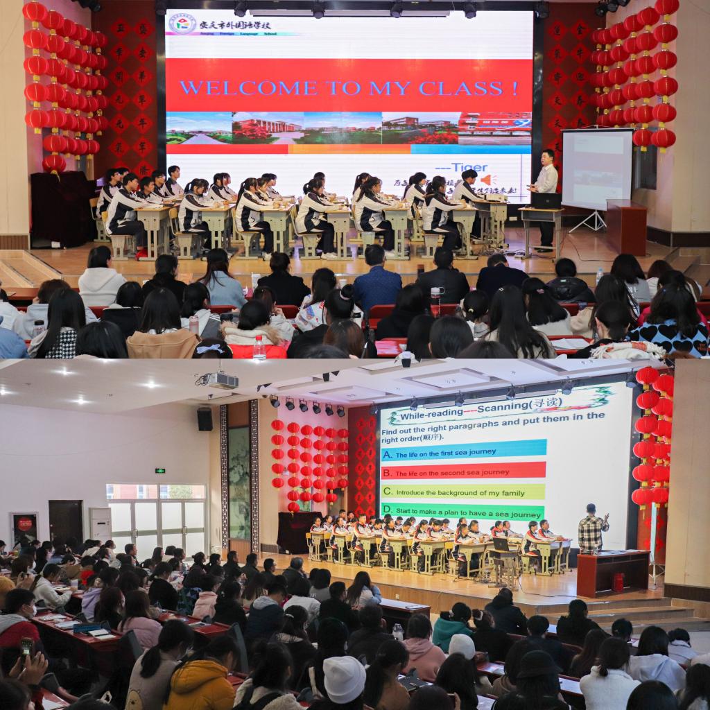 安庆市外国语学校初二年级杨春老师结合教学目标,以动画视频为引,凭借扎实的教学功底与清晰的教学设计,为师生展示了一堂精彩的英语阅读指导课。高二年级徐最太老师给师生呈现了一节由浅入深、环环相扣的高中英语课堂教学。他以标准的口语发音、抑扬顿挫的韵律节奏和精彩的课堂内容赢得了学生们的阵阵掌声。