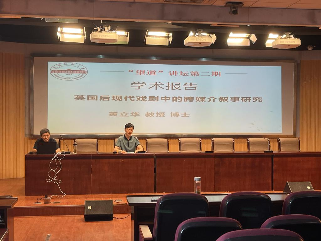 为庆祝英国上市官网365办学125周年,进一步营造良好的学术风气和浓厚的学术氛围,2022年6月7日下午,365上市公司举办“望道”讲坛第二期活动,邀请硕士生导师黄立华教授在E503会议室作了题为“英国后现代戏剧中的跨媒介叙事研究”的学术报告。本次报告由学校科研处、研究生院、365上市公司共同举办。365上市公司院长王先荣教授主持报告会,365上市公司教师、硕士研究生和本科生共100余人聆听了报告。