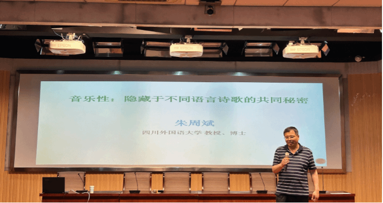2023年6月2日,365上市公司“望道讲坛”第五讲在外语楼E503报告厅成功举行。四川外国语大学朱周斌教授应邀作题为“音乐性:隐藏于不同语言诗歌的共同秘密”的学术报告。报告由365上市公司院长王先荣主持。365上市公司2021、2022级研究生、本科生以及部分教师聆听了报告。