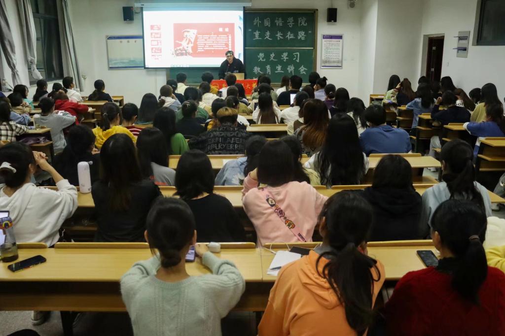 “有谁可以和我们分享一下有关遵义的小故事吗?”“我可以!”宣讲过程中还穿插了观看党史动漫、有奖党史竞答等环节,外国语言文学类专业2021(4)班的郭荣站起来讲述了一段“红军坟”的故事。“这是我第一次通过这种宣讲的方式来学习党史,学长学姐们用自己亲身经历的红色旅程来向我们介绍长征,给了我很大触动!”郭荣表示,作为一名大一新生,她会在大学四年中坚定理想信念,用实际行动来证明对前辈们的致敬。
