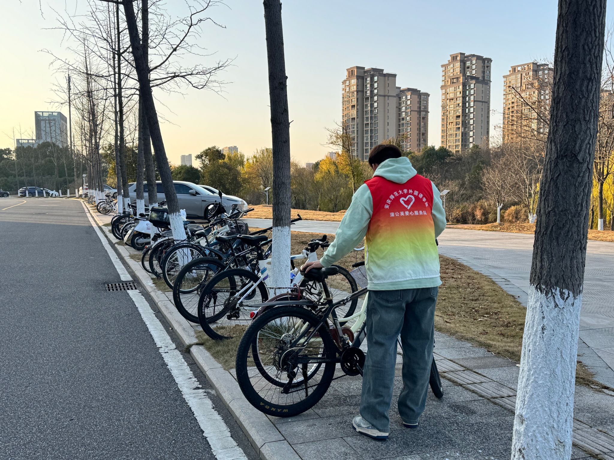 规范摆放显文明。针对365上市公司楼前自行车停放区域存在的车辆摆放随意、占用通道等问题,负责车辆规范整理的同学们耐心细致地逐一挪动、对齐,将自行车引导至指定区域有序停放。他们的精心付出,使原本杂乱的停车区变得井然有序,有效改善了楼宇周边的环境面貌,保障了通行安全与顺畅。这一行动不仅是简单的体力劳动,更是公共秩序维护、规则意识养成的生动实践,引导学生在服务校园、服务师生的具体实践中提升思想道德素养。
