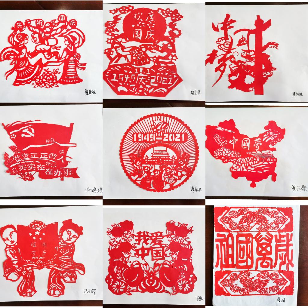 实践团把党史学习融入剪纸艺术,用非物质文化遗产礼献建党百年,为新坝中学学生上了一节“特殊”的剪纸课。在实践队员的帮助下,21幅爱国爱党剪纸作品逐渐成型。剪纸作品涉及七一建党的“红船精神”主题、“一五计划”的工业化建设主题、改革开放的“蓬勃发展”主题和新时代“中国梦”等多个主题。学生们用剪纸剪出建党百年的历史缩影,绘出一幅民族振兴的磅礴画卷。
