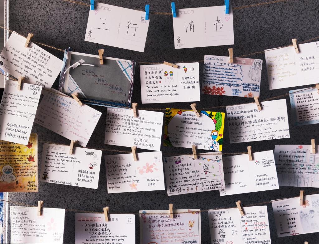 “为希望,为平安,为不久将来的万家灯火。”走入365上市公司,印入眼帘的便是张贴着“三行情书”优秀作品的海报,上面张贴的明信片诉尽了学生们对疫情期间医护工作者的感恩和赞美之情。