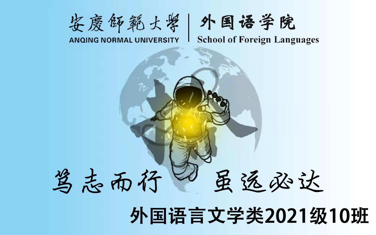 外国语言文学类专业2021(10)班从中国航天事业的蓬勃发展和中国宇航员不惧困难的精神中得到灵感,选择将宇航员的简笔画和地球作为班旗中心与主体,同时大写数字“拾”不仅象征着“十班”,更有“飞天拾光”的寓意,表达了班级全体同学致力于学习中国宇航员的笃志精神——珍惜时光,奋力追光。