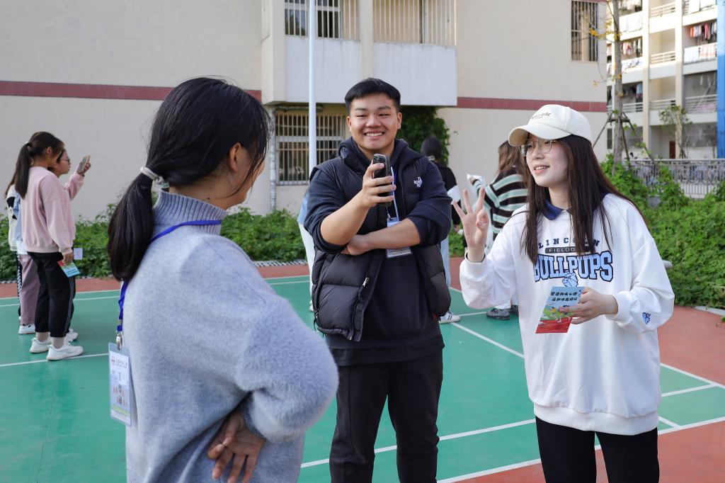 丢沙包游戏一度成为全场热门游戏,不少学生在该场地内排起了长队。参与学生有五次投沙包机会,成功将三个及以上沙包丢进桶中即算游戏胜利。有着四次失败经历,外国语言文学类专业2022(12)班的吴飞身为“老玩家”,认为该游戏“看似简单实则难”。在第五次游戏中,他成功投进3个沙包。看着明信片上的印章,他说,“像是上幼儿园时老师盖在脸上的小红花,有种满满的成就感。”