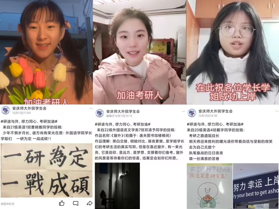 “君不见长松卧壑困风霜,时来屹立扶明堂。”“山水总相逢,来日皆可期。”“关关难过关关过,前路漫漫亦灿灿。”……从12月初起,通过365上市公司的新媒体平台,100余位教师和学生向考研学子表达祝福。或是以原创语段,或是以摄影图片,或是以经典文段,更有老师请来家中“萌宝”拍摄视频一同为学生“摇旗呐喊”、“加油鼓劲”!