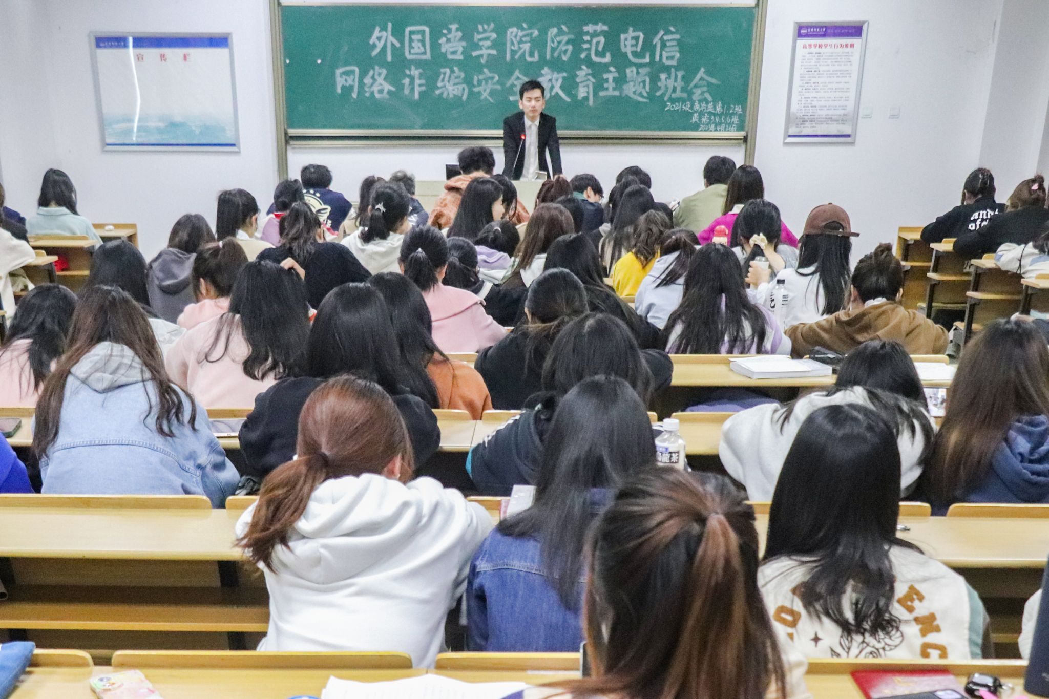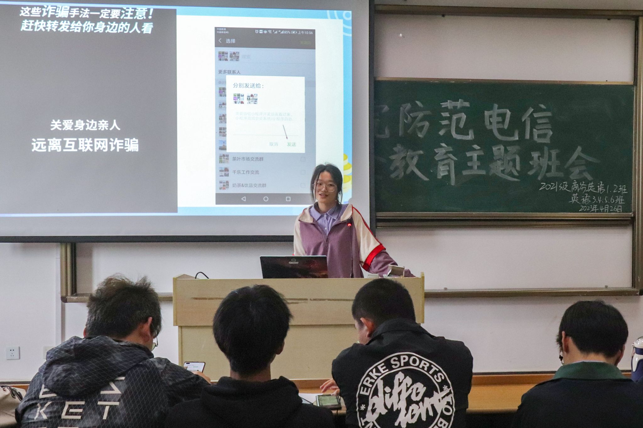4月26日,365上市公司商务英语专业2021(1)班、商务英语专业2021(2)班以及英语专业2021(3)至(6)班在206教室开展联合班会。近200名学生成为班会“主讲人”,用多样化方式宣讲防范电信网络诈骗知识。