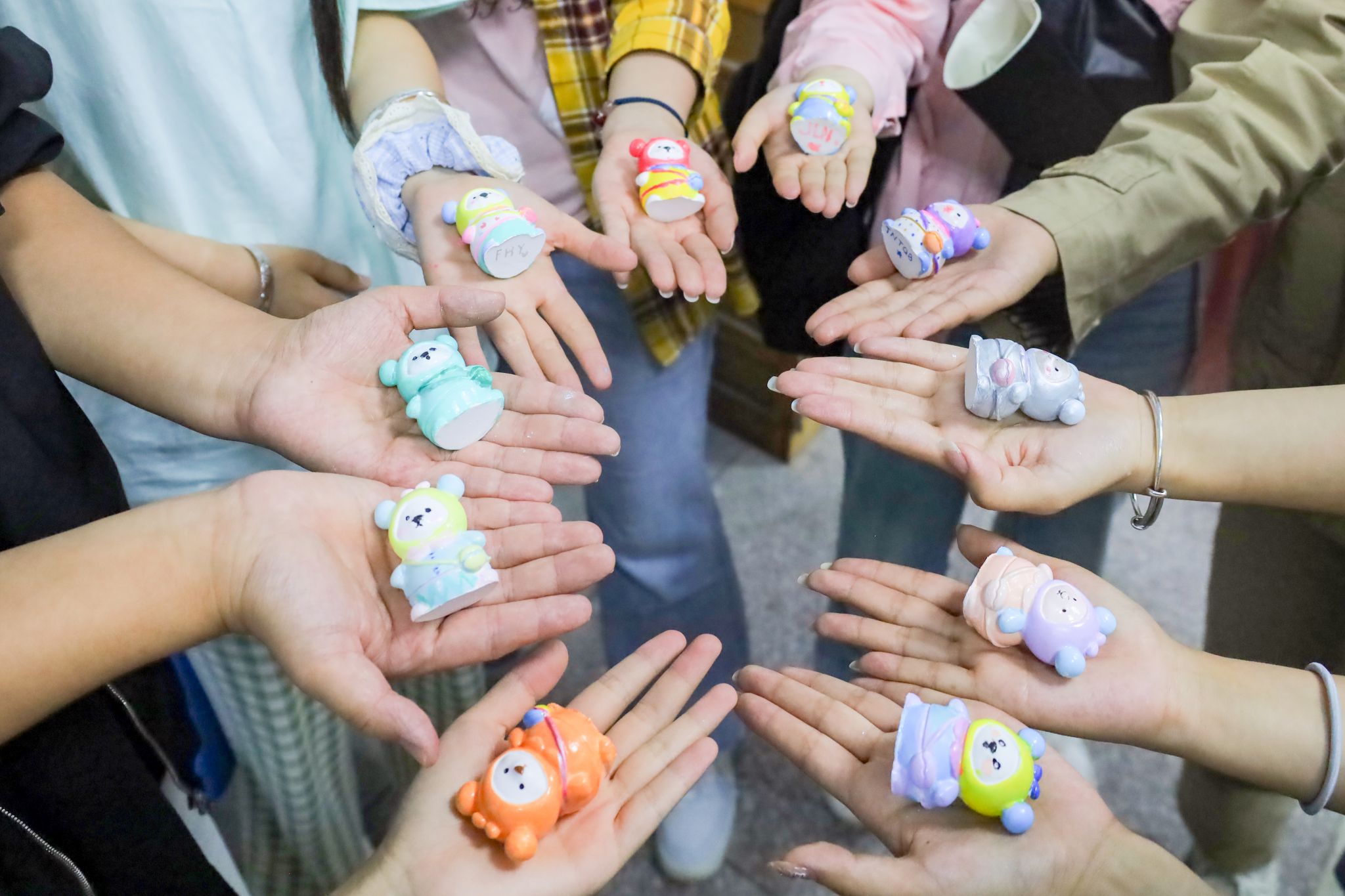 情态各异的石膏背包小熊被整齐摆放,学生们围坐一起与小熊们“打卡”留念。“用心涂制的过程不仅仅是简单的颜料叠加和创造,更是一次自我情感的梳理和表达。”聊及选择彩绘石膏娃娃作为活动内容的初衷,外国语言文学类专业2023(4)班的桂夕表示,由于小时候经常在街头涂制石膏娃娃,也希望身处大学的学生能够通过这一活动重新找回那份童年快乐,用画笔绘出属于自己的童年世界。