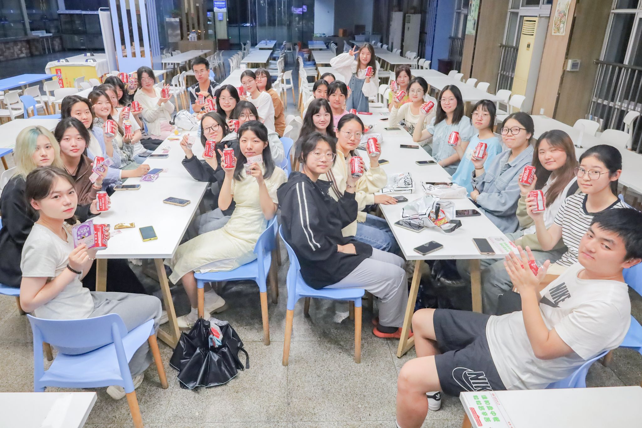 “万物都是自由诗”“和光同尘,与时舒卷”“追光而遇,沐光而行”……黑白礼袋、易拉罐可乐,看似寻常的物件却“暗藏玄机”。桌子上整齐排列的34瓶可乐上刻着每位学生的姓名以及他们对彼此的美好寄语。活动间隙,外国语言文学类专业2023(5)班的方冰冰为参与学生分发礼物刮刮乐。“哇!我的是一捧鲜花!”“礼品袋里面有旺仔牛奶和喜之郎果冻!”学生们在“兑奖区”拆开礼袋,分享彼此手中的礼物。
