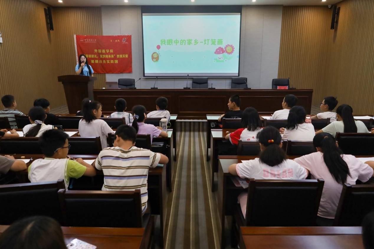 先用铅笔打型勾线、水彩笔上色,再将创作好的卡纸裁剪成灯笼样式,粘贴在实物上……在“我眼中的家乡”灯笼画课上,实践团成员化身为小老师,向学生介绍着灯笼画的制作方法。“灯笼画是中国传统文化的重要元素之一,具有浓厚的文化底蕴和象征意义。”据设计学类专业2023(1)班的陆明慧介绍,社会实践正式开始前一周,她与小伙伴便着手策划授课内容。她表示,以家乡作为灯笼画主题能够很大程度上激发学生们对家乡的热爱和认同感,提升责任感,同时深刻体验传统文化的价值和魅力。